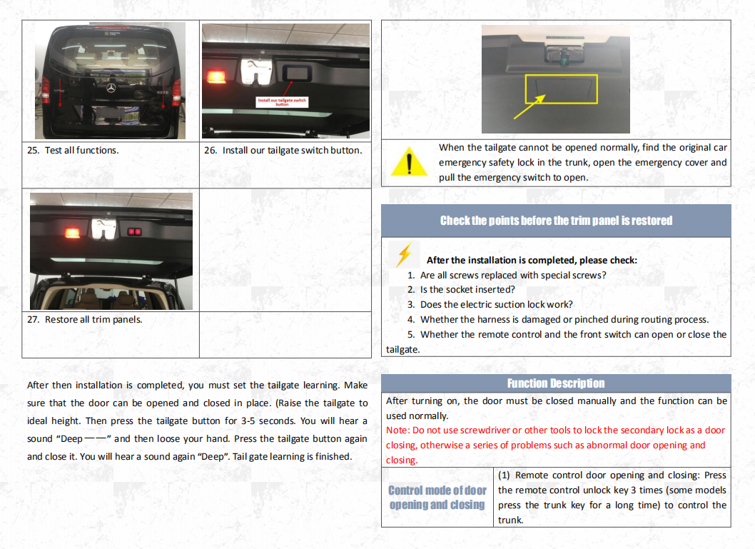 10. If the key fob has a tailgate open button, press this button for 3s to open and close the tailgate. If don’t have, you need to press the unlock button 3 times to open and close the tailgate. If you have any problems, please contact our after-sales: info@kaimiao-group.com